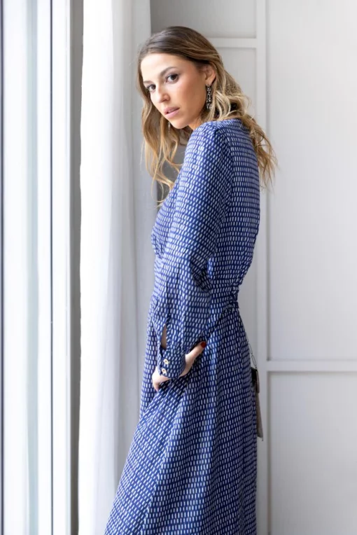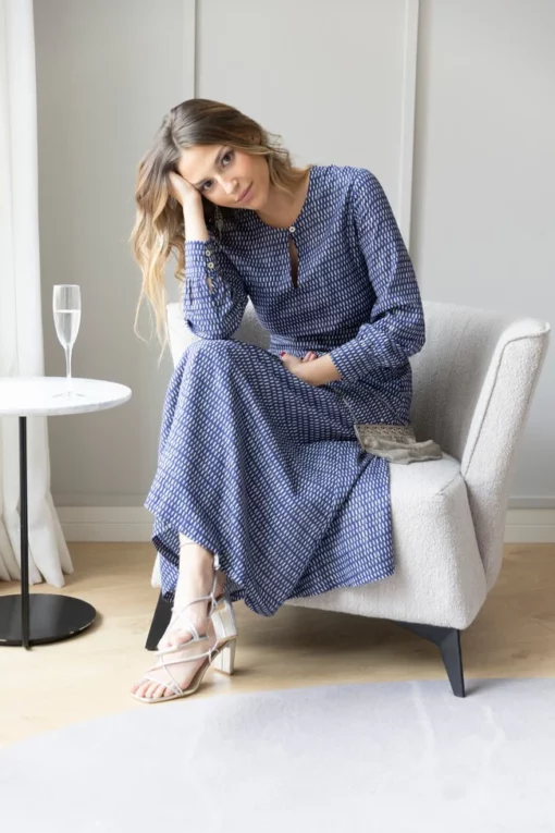 Vestido largo realizado en un tejido de viscosa con una pequeña mota en dorado.