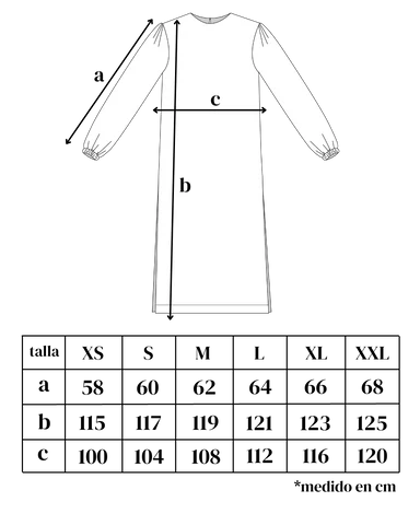 Vestido midi de manga larga y cuello a la caja con botón en la espalda. Aperturas laterales y puños ajustados con elástico.