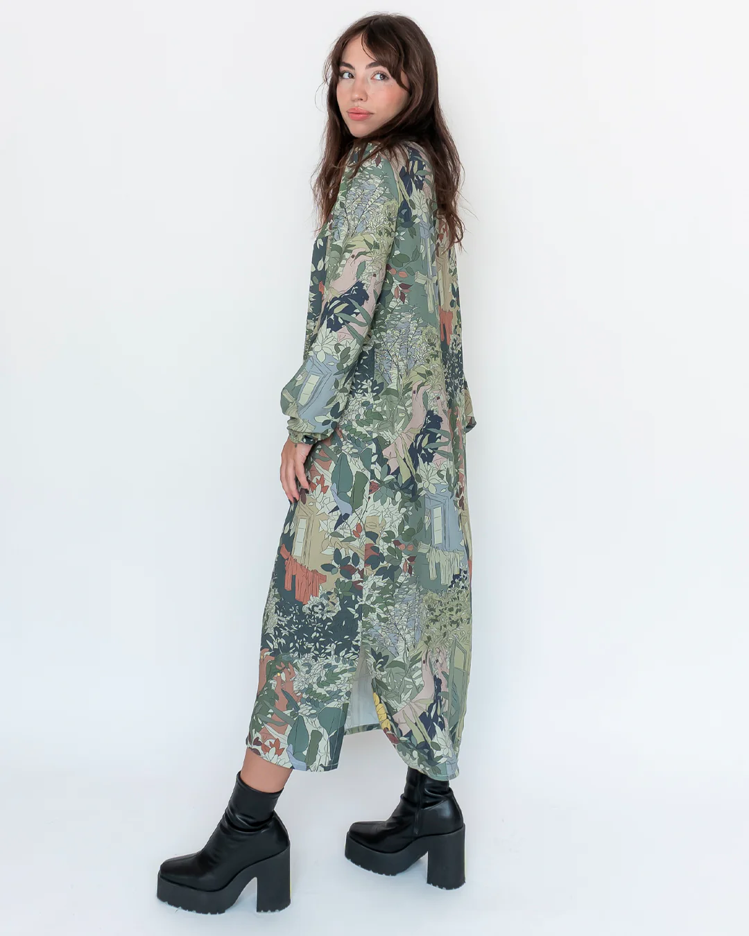 Vestido midi de manga larga y cuello a la caja con botón en la espalda. Aperturas laterales y puños ajustados con elástico.