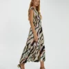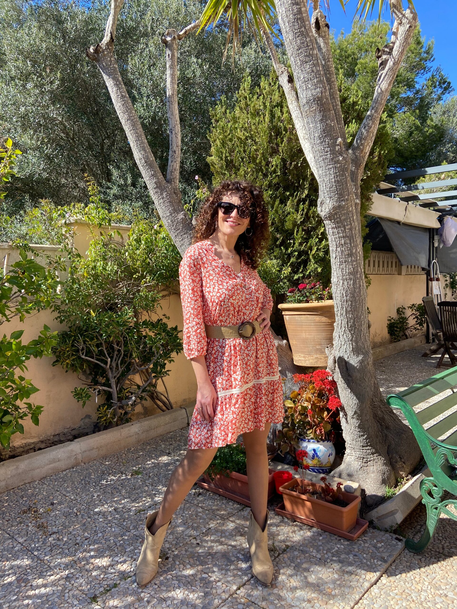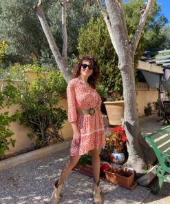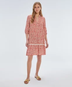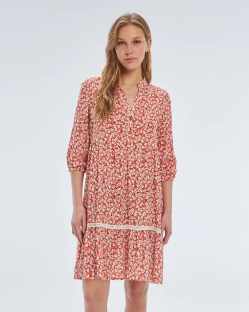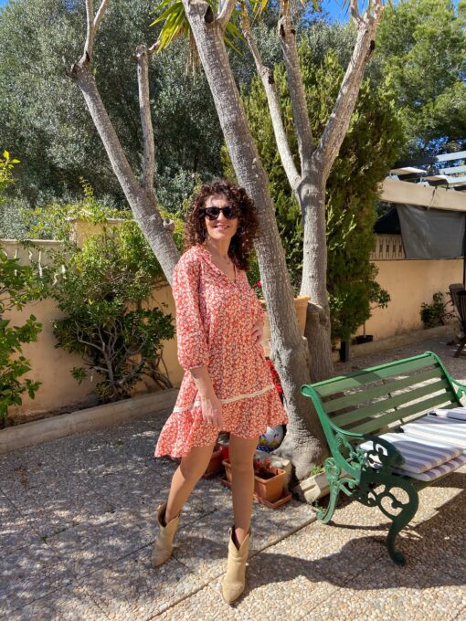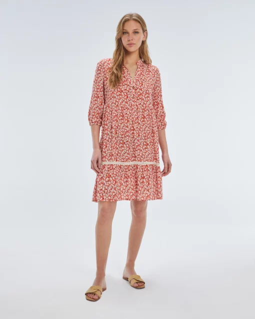Vestido por la rodilla escote mao abrochado hasta la cintura, con volante en la parte de abajo. Manga 3/4 con goma. Tejido muy fluido.