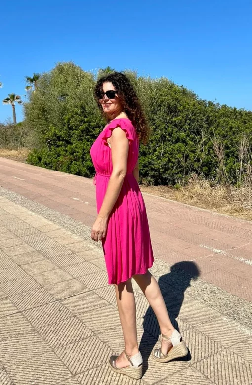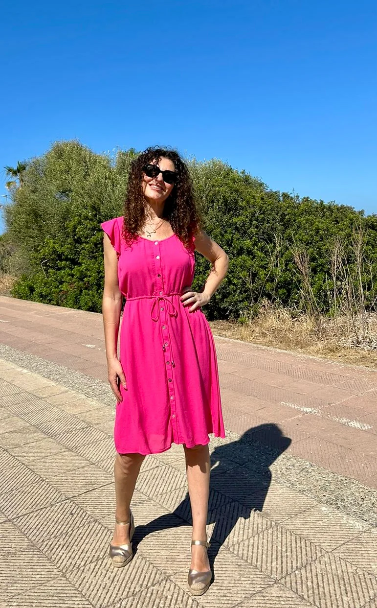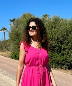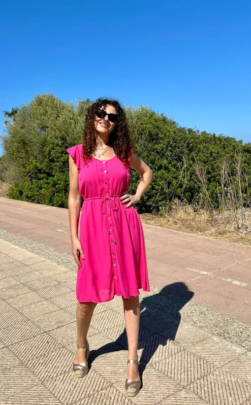 Vestido de bambula, por debajo de la rodilla, abrochado hasta abajo, escote en V y con volantes en las mangas. En la cintura lleva un cordón de la misma tela para entallar más o menos.