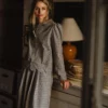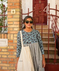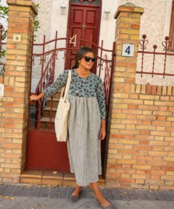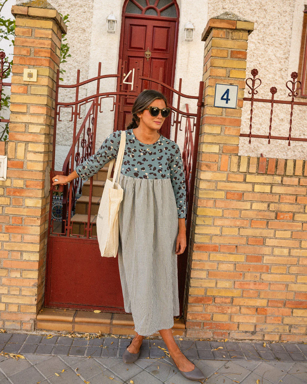 Nuestro guiño de este otoño al print animal es este vestido que lo combina en tono verde gris, con falda de rayas color antracita.