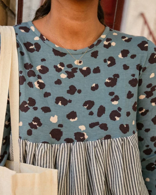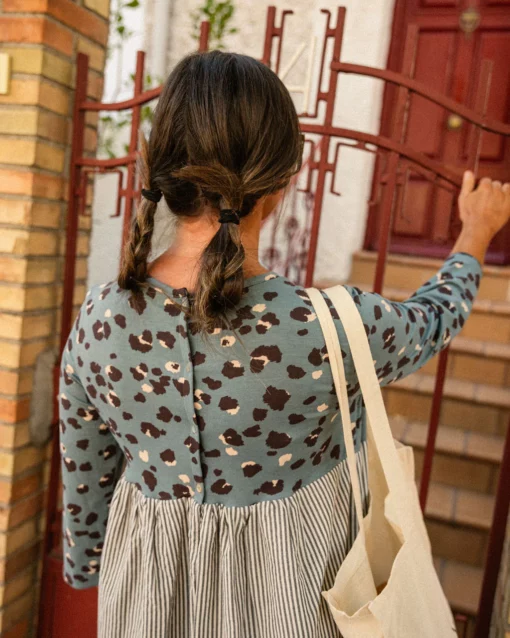 Nuestro guiño de este otoño al print animal es este vestido que lo combina en tono verde gris, con falda de rayas color antracita.