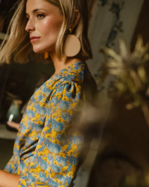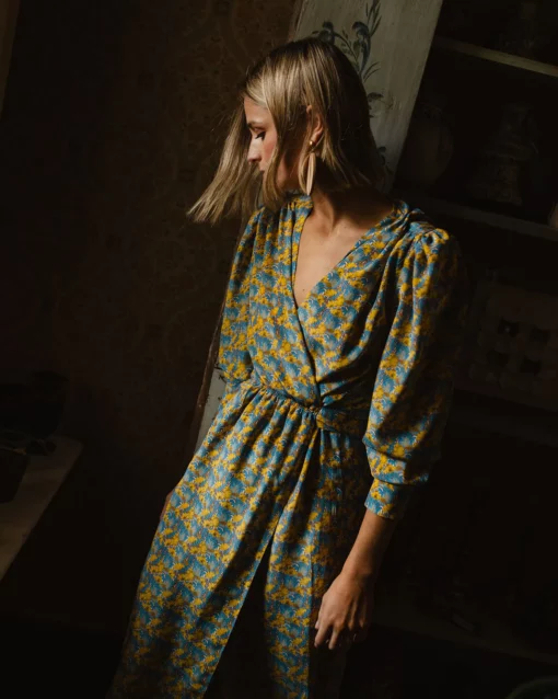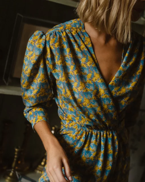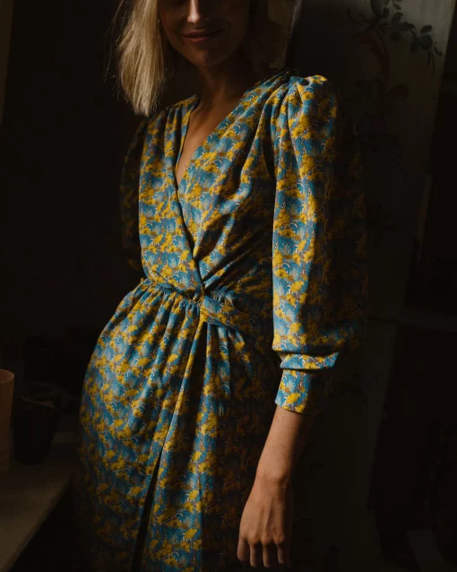 Vestido cruzado de seda de Liberty con frunces en el pecho.