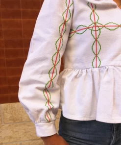 Measurements: 40″/ 102cm bust – 23″ / 58cm sleeve length – 23″ / 58cm blouse length.