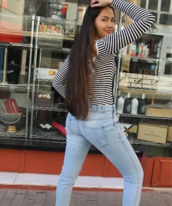 Model is a UK 6/8 and is 5’7″ tall.