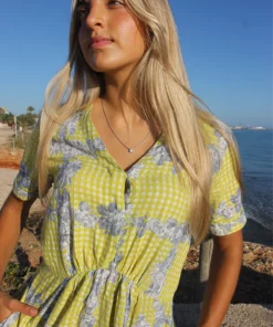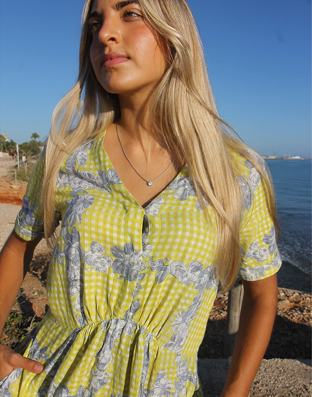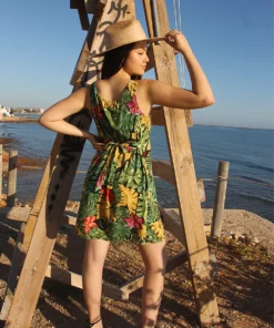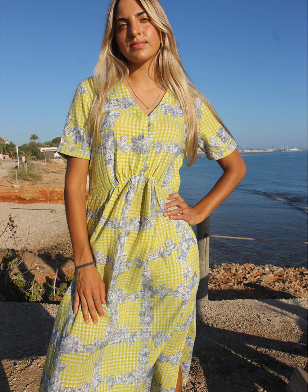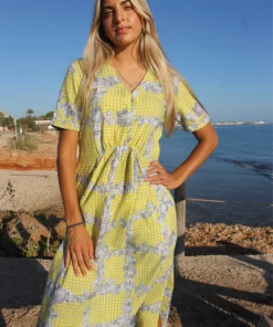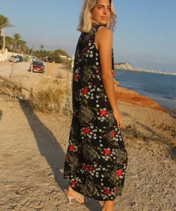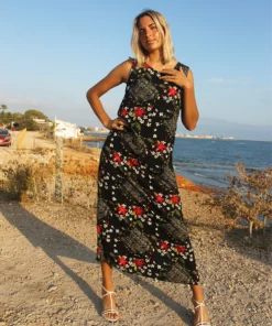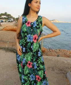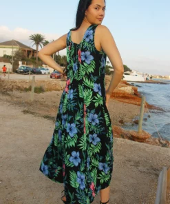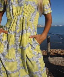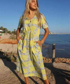 Measurements: 38″/ 97cm bust – 30″ / 76cm waist – 46″ / 117cm hips – 9″ / 23cm sleeve length – 50″ / 127cm dress length.