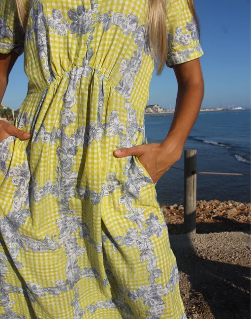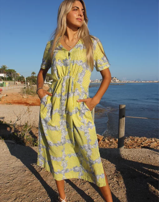 Measurements: 38″/ 97cm bust – 30″ / 76cm waist – 46″ / 117cm hips – 9″ / 23cm sleeve length – 50″ / 127cm dress length.