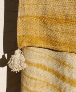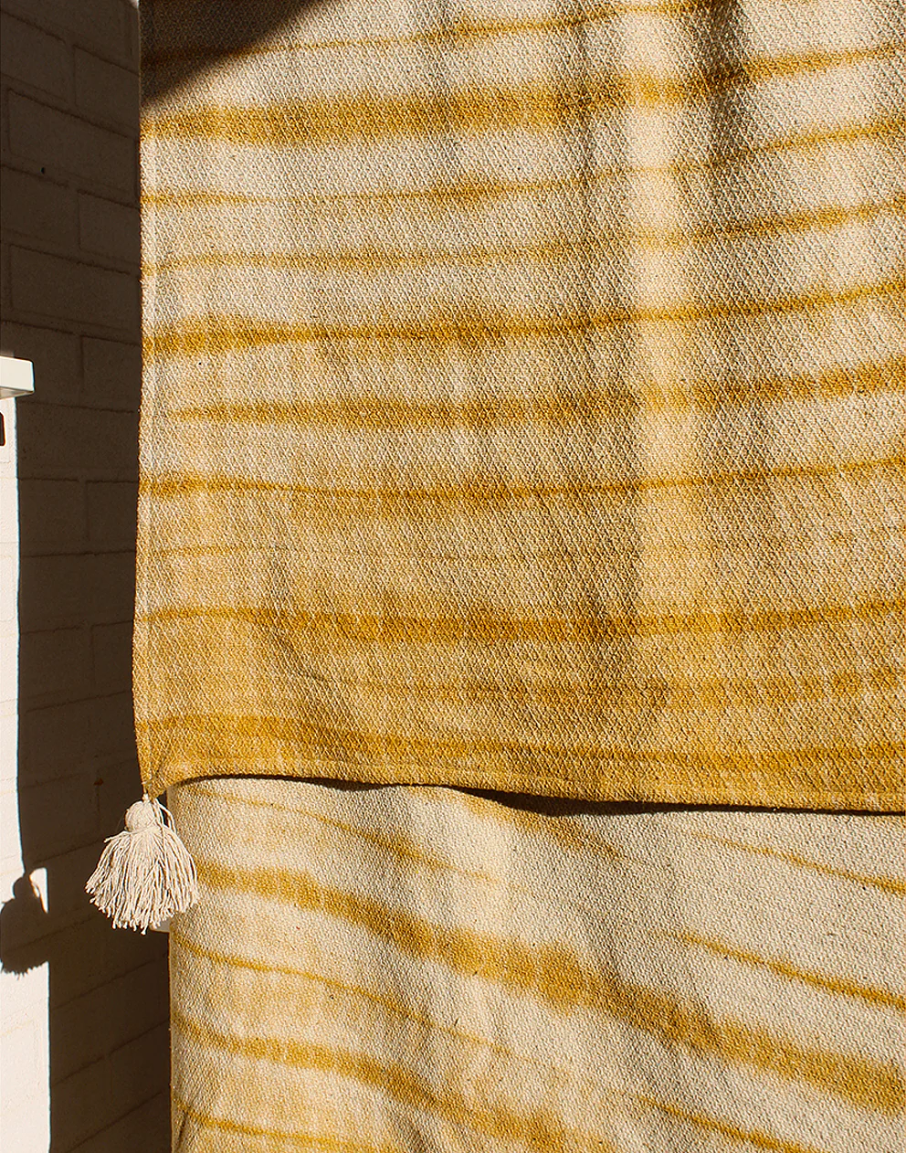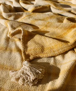 Extra large yellow tie dye print throw, made from recycled cotton. White and yellow tie dye stripes with large tassles to corners in a natural finish.
