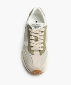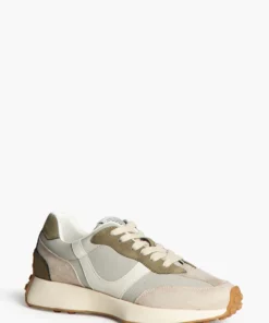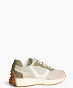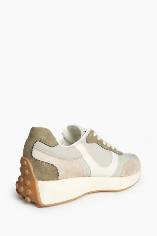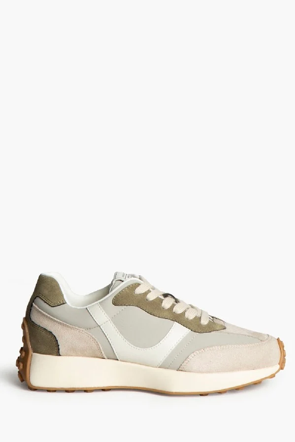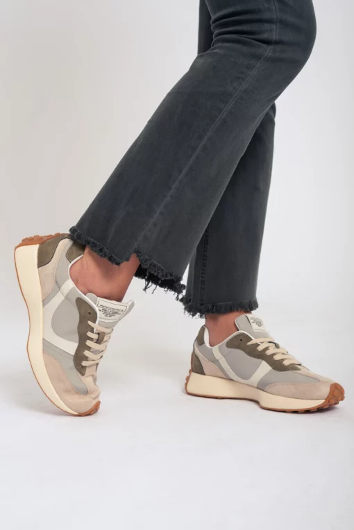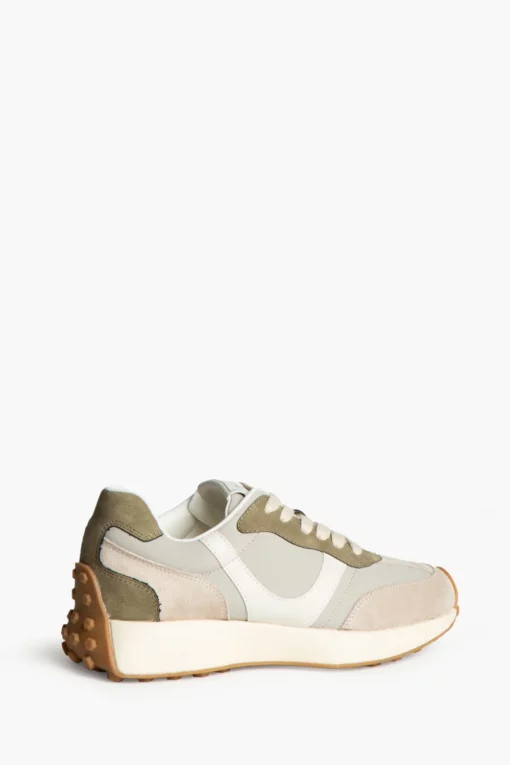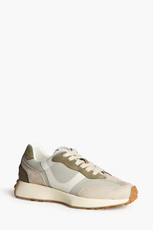 Zapatilla deportiva estilo running. Cierre cordones. Corte en combinación de materiales y colores arena y taupe. Suela dentada en tono miel.
